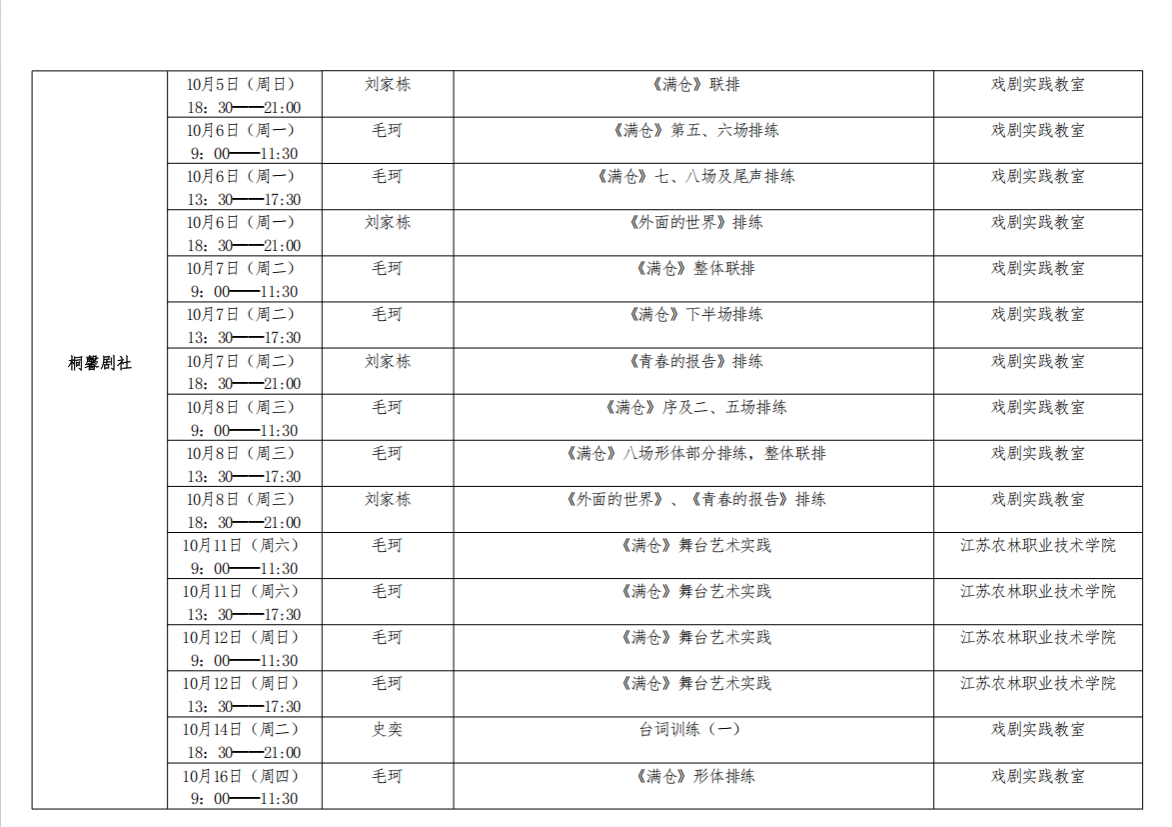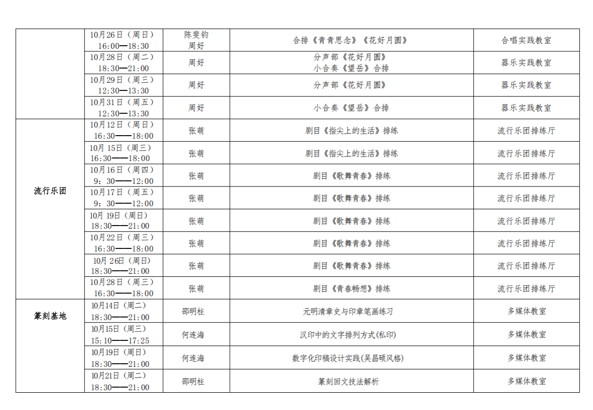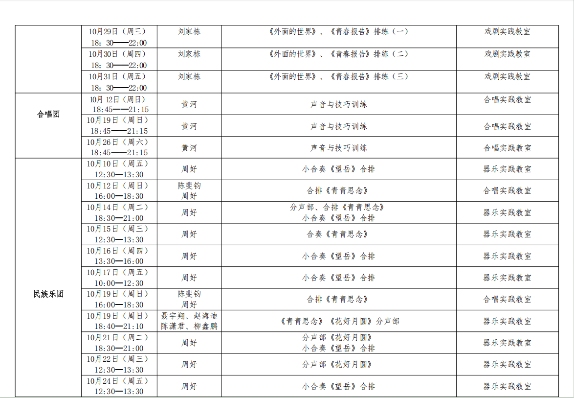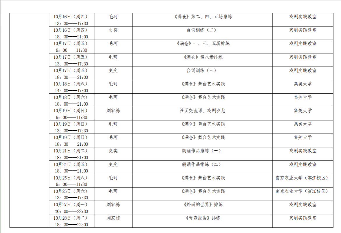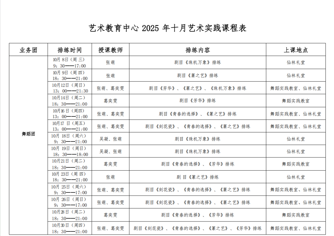南京财经大学大学生艺术团2025年10月艺术实践课程表